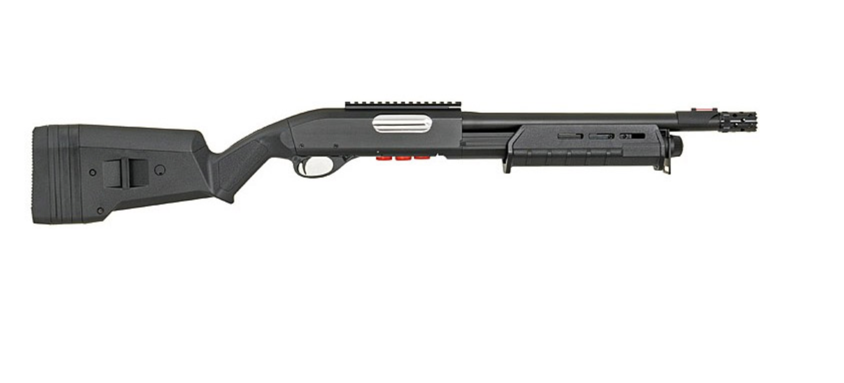 Full metal CYMA is provided with a spring propulsion system that requires arming before each shot. The shotgun is equipped with 3 barrels, which gives the user the ability to shoot 3 bbs at once.