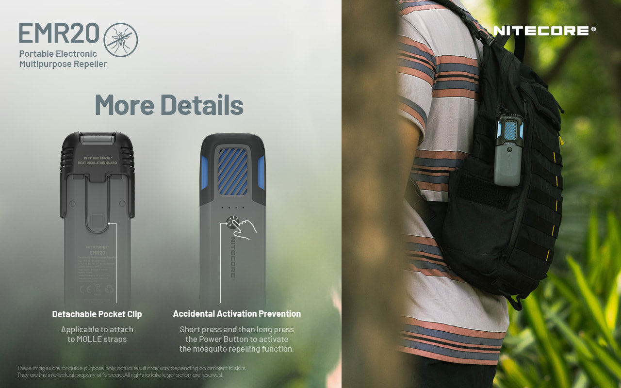 The Nitecore EMR20 is a portable, rechargeable, dual-mode mosquito repeller that can double as a power bank for the family picnic or veteran outdoorsman. The EMR20 accepts the blue pyrethroid based pad that is activated by a highly efficient electric heating pad. With a tough pocket clip, the EMR20 can be clipped to a backpack or belt or placed on a table for easy hands-free use. Create and maintain a comfort zone free of pests in up to a 16ft radius with the EMR20 for all outdoor adventures.