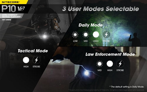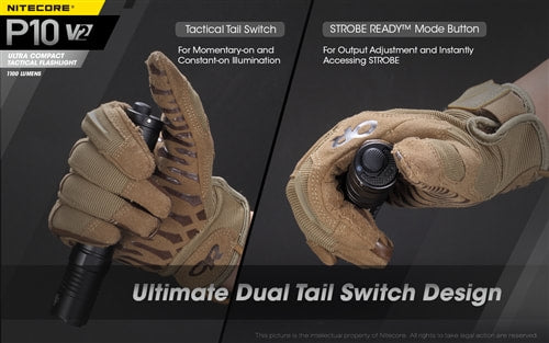 The NITECORE P10 v2 is the compact tactical flashlight you have been waiting for. This 1100 lumen flashlight reaches up to 220 yards of throw distance with the latest Cree XP-L2 V6 LED. Constructed using aero-grade aluminum with diamond knurling in key locations for enhanced grip, the P10 v2 maintains an even 1'' diameter for easy handling, and is lightweight enough for daily carry with the included NTH10 hard holster.