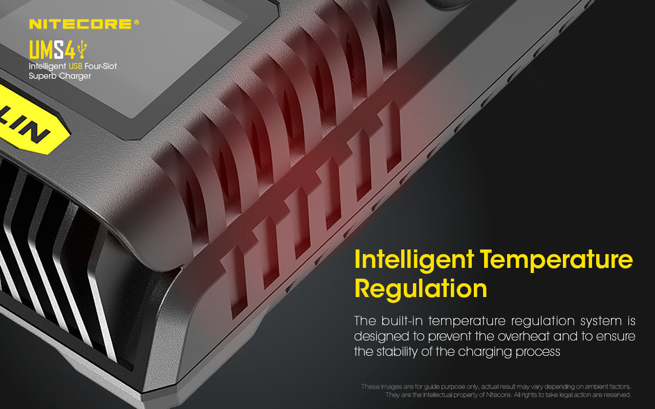 Introducing the NITECORE UMS4 Intelligent USB dual-slot charger designed to recharge your batteries fast, safe and efficiently. The UMS4 will reach a maximum total output of 4000mA when using a 2A output USB power adapter. When the charger is powered or connected to quick charge (QC) power adapter, the screen will show "Quick Charge" and the single slot will achieve a max output of 3000mA.