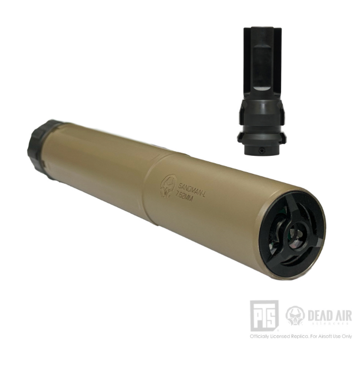 The PTS Dead Air Sandman airsoft silencers and muzzle devices are precision made to faithfully replicate Dead Air Silencer products under official license. The PTS version of the Dead Air Keymo mount system allows for tool-less rapid quick attachment and detachment of the mock suppressor and ensures secure precision mounting. The PTS Dead Air suppressors are constructed from 6000 series aluminum and are available in multiple lengths - short K length, S length, long L length - and colors - Black and FDE - and will be available either as a mock suppressor or a tracer unit.