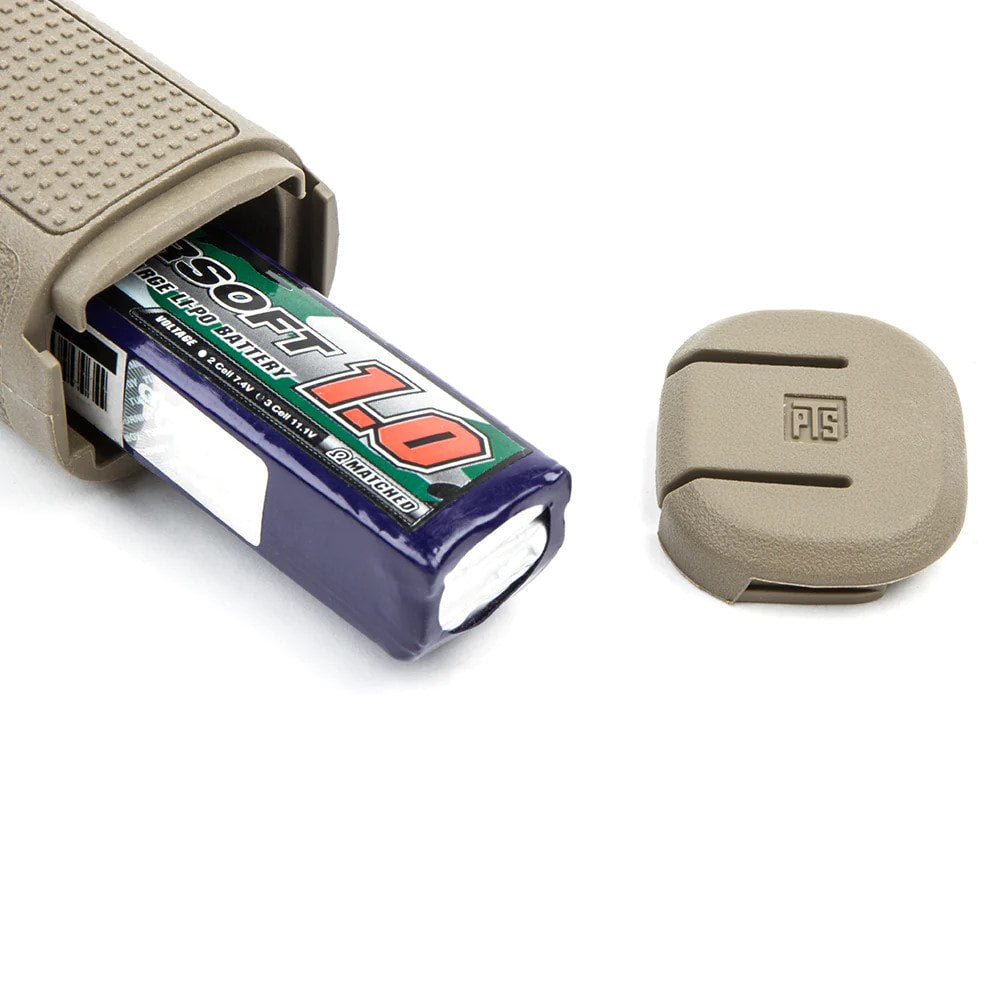 The PTS Enhanced Polymer Foregrip 2, or EPF2, has a carefully conceived, streamlined, ergonomic design with slightly revised texturing for superior grip and control. Dupont Zytel polymer construction and hardened steel hardware ensures its survivability under adverse use conditions. The EPF2 has also been revised with a lower profile on top to be able to mount on to a wider variety of railed handguards. Like its predecessor, it features a storage compartment with a sliding access plate at the base, and channels at the top for battery wiring to be able to pass through. This allows the EPF2 to hold certain airsoft appropriate lithium polymer batteries (such as an 11.1V 1000mah airsoft battery, see specifications for internal cavity dimensions.) for front wired electric airsoft guns thereby removing the need for a battery box. The compartment can also be used to store other miscellaneous items and tools.