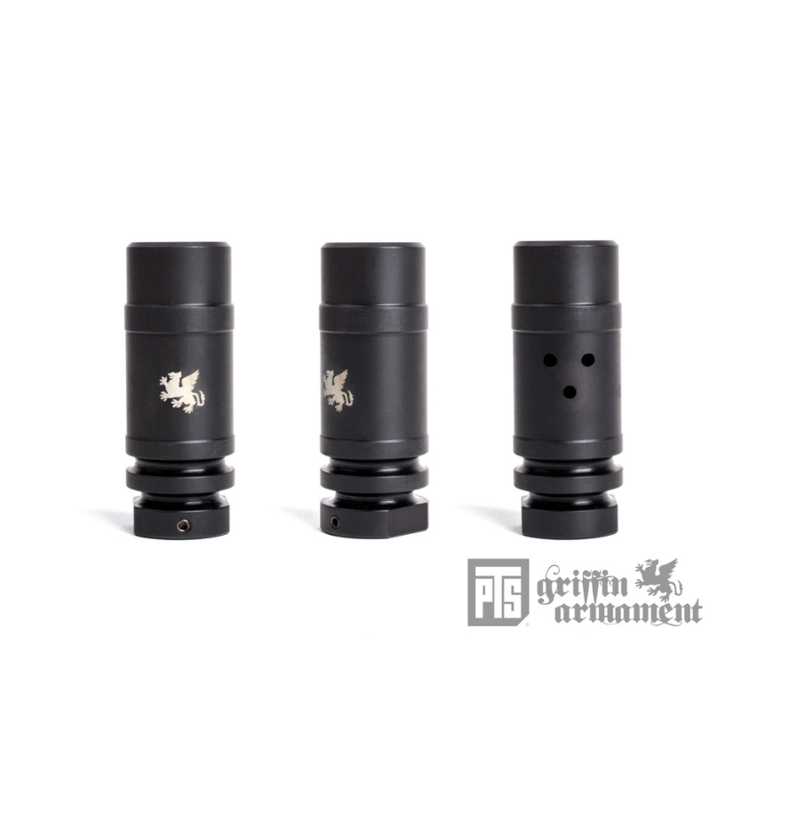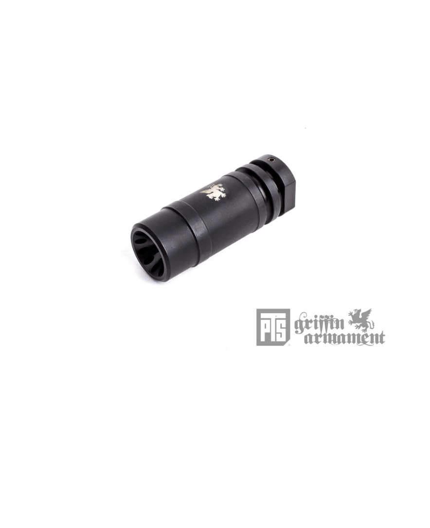 The Griffin Armament M4SD Linear Comp is the only muzzle device from Griffin Armament without any side ports, thus reducing side blast to other people beside the shooter's position. Instead it features three ports on top for muzzle neutrality as well as a de Laval nozzle in front to project linear flow of pressure down range. The Airsoft version has been designed to be compatible with any A2-compatible suppressor mount including the PTS Griffin Armament M4SD Suppressor.