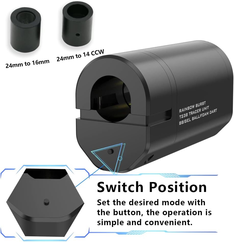 T238 Burst tracer unit is designed for the airsoft shotguns. It has19-24mm, 24mm to 14 CCW and 24mm to 16mm adapters can be widely applicable to BB/ NERF dart/ Gel ball blasters.