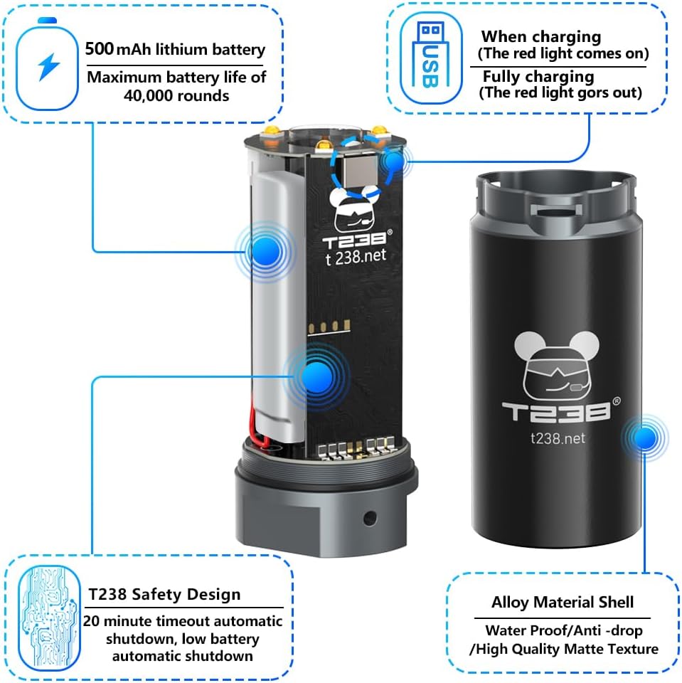 This device has a built -in 500mAh battery, which lasts for 25,000 rounds, supports 50rps rate of fire. When airsoft accessories will be automatically shutdown in the low battery state or Standby for more than 20 minutes. It is equipped with a Micro USB cable for charging at any time.