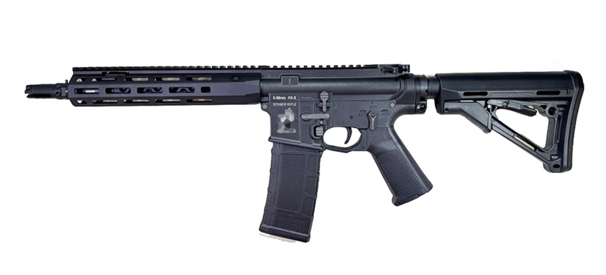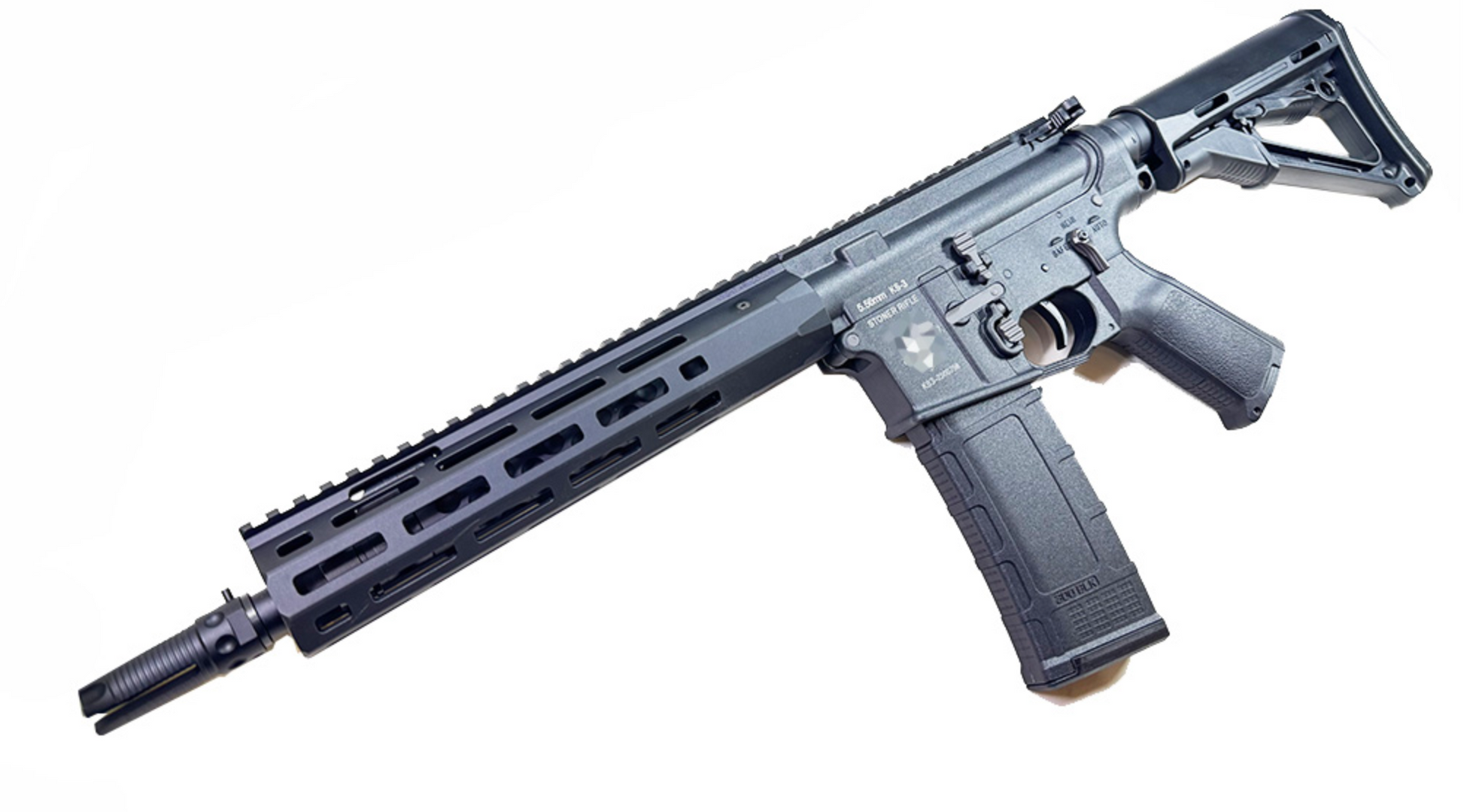 - CNC machined M-LOK rail, CNC machined iconic KAC outer barrel, metal flash hider, metal buffer tube, metal charging handle, metal dust cover